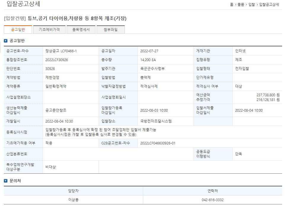 | ● 본 공고건은 제한경쟁입찰에 부치는 사항으로 낙찰 후 계약 미체결시 「국가를 당사자로 하는 계약에 관한 법률 시행령」제76조 제1항 제2호에 의거 부정당업자로 제재되어 입찰 참가자격을 제한받게 될 수 있습니다. 또한 사양을 확인하고 이행해야하는 사업으로 관련 법령 및 조달 품목에 대한 규격서 (국방규격, 도면, 구매요구서 등), 견본, 단가, 납품기한 및 단종여부 등 조달에 관한 사항을 입찰서 제출 전에 필히 검토 후, 납품 가능 여부를 반드시 확인해야 하며, 이를 확인하지 못한 책임은 입찰참가자에게 있습니다. · 규격서(국방규격, 도면, 구매요구서 등) : 규격목록과(규격 042-616-6951~8, 구매요구서 042-616-6971~5) · 견본열람 문의 : 종합보급창 보급운영과(044-251-6093) · 품목담당관 : 기동일반장비정비과(042-616-4411~2) ※ 자세한 사항은 공고문 [11. 기타 '차'항]을 참조하시기 바랍니다. |